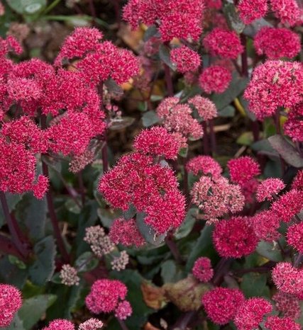 "Седум Ред Кали (Sedum Red Cauli) Высота растения 40 см. Быстрорастущий. Листья пурпурно-зеленые. Соцветия диаметром до 10 см, насыщенно красной окраски"