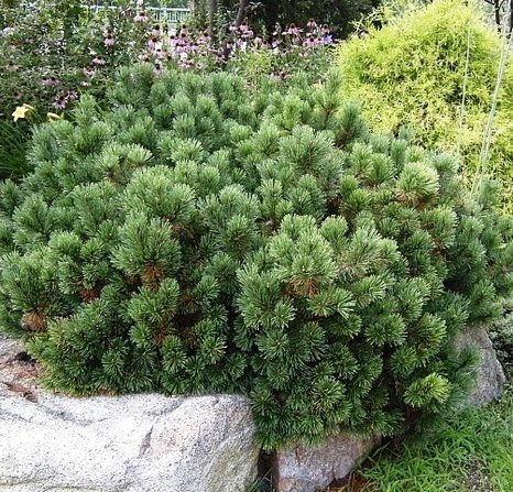 Сосна горная Пумилио - это компактный карликовый кустарник с густой распростертой кроной. Хвоя зеленая, жесткая короткая (3-5 см). Максимальная высота – 1,5 м, диаметр - 3 м. Шишки ширококонусовидные 2-5 см, плодоношение начинается в 6-8 лет. Направленные вверх побеги создают плотный купол над распростертыми стелющимися ветвями. Сосна очень надежна и неприхотлива и вполне достойна стать основой любого сада средней полосы и севера России. То, что этот хвойный вечнозеленый кустарник не боится стрижки, делает его универсальным и абсолютно пригодным для целей ландшафтного дизайна. Сосна горная Пумилио солнцелюбива, морозо- и засухоустойчива.