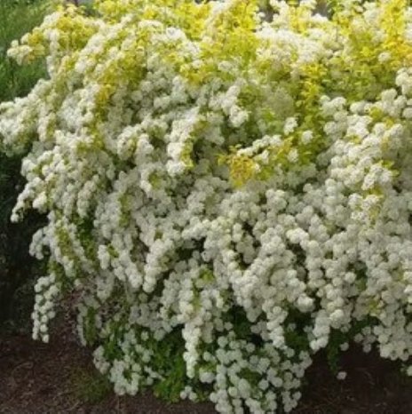 Очень красивый кустарник с ярко-желтыми листьями, сохраняющими цвет весь сезон. Ветви дугообразно поникающие, усыпаны шапочками белоснежных цветков. Яркое пятно в цветнике все лето. Высота 120 см. Цветет в мае очень обильно. Укрытия не требует, зимует отлично