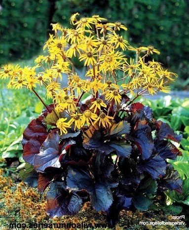 Листья крупные, блестящие, темно-фиолетовые. Высота во время цветения 100 см. Цветет в июле-сентябре. Соцветия – корзинки с ярко-оранжевыми лепестками, собраны в метельчатое соцветие.Предпочитает полутень и даже тень. На солнечном месте, даже на влажных почвах, в солнечную погоду листья будут вялыми. Почвы плодородные, глинистые, влажные. Зимостоек. На одном месте растет до 10 лет. Норма посадки 3-4 шт/кв.м. Практически ничем не болеет.