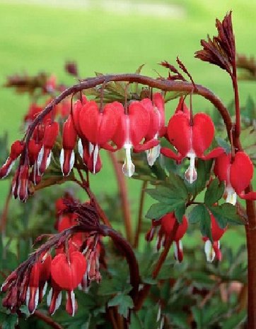 Дицентра - изящное многолетнее корневищное растение до 70 см высотой с сильно разрезными перисто-сложными листьями, зелеными, с сизым оттенком. Цветки красной окраски, повисающие, сплюснутые. По форме напоминают сердце, а двойная шпора на лепестках как бы пронзает его стрелой, отсюда и название - Разбитое Сердце. Собраны в однобокие соцветия - кисти.