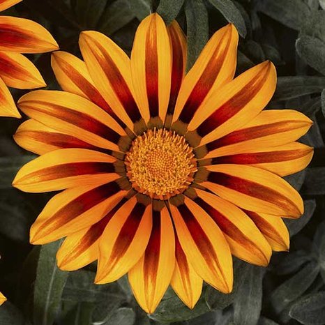 Растения с необычной серебристой окраской листьев. Высота 20-25 см. Ширина куста 20-25 см. Цветки оранжевой окраски с широкой бодовой полосой по центру лепестков, диаметром 6-8 см. Раннецветущая серия. Прекрасно подходит для выращивания в горшках Ø от 9 до 12 см.