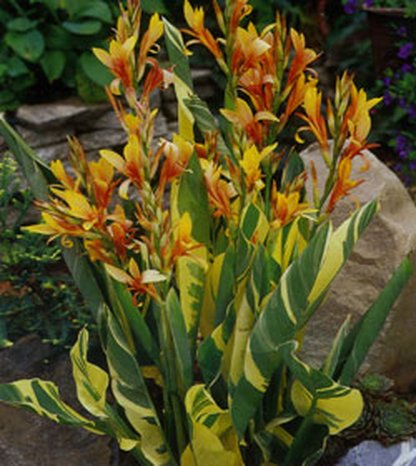 Высота растения до 120 см. Листья зеленые с желтыми прожилками. Цветки крупные, оранжевой окраски.