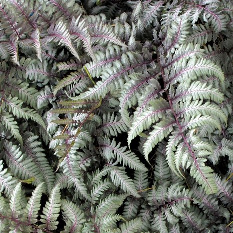Кочедыжник (папоротник) ниппонский Сильвер Фолс – многолетнее тенелюбивое растение. Высота растения 40-50 см. Ослепительно серебристые листья контрастирующие с красными венами. Название дано в честь известных Орегонских водопадов. Весной появляется позже других кочедыжников.