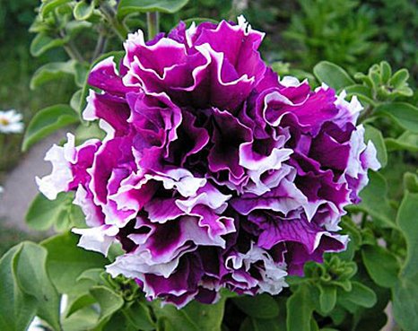 Крупно цветковый гибрид с махровыми цветками фиолетовой окраски и бахромчатыми лепестками с белой каймой. Диаметр цветка до 15 см. Высота куста до 30 см. Цветение пышное, длительное.