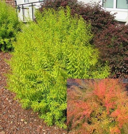 Спирея Тунберга Ogon - Очень декоративный густоветвящийся кустарник высотой и диаметром 90-120 см.Листья изящные, узкие, длиной 4 см и шириной 0,5 см, похожи на листья ивы, золотисто-желтые весной, ярко-зеленые летом и оранжевые осенью.Цветки белые, в зонтиковидных соцветиях, цветение обильное в мае-июне.Эффектный сорт при посадках с темнолиственными растениями и хвойниками. Красиво смотрится в свободно растущих изгородях.