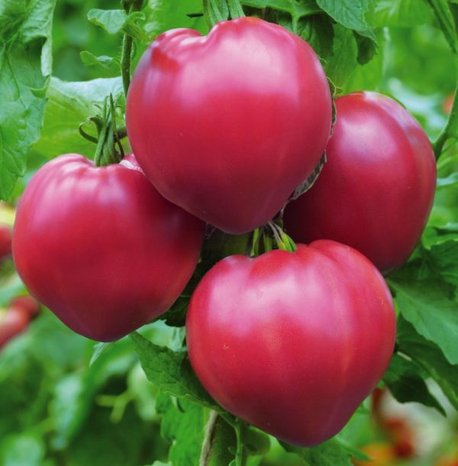 Среднеспелый (115-120 дней) индетерминантный сорт для выращивания в открытом грунте и теплицах. Плоды сердцевидные, розово-малиновые, крупные, 160-210 г, до 400 г, отличного вкуса, преимущественно салатного использования. В марте семена высевают на слегка утрамбованный грунт, мульчируют торфом или почвенным слоем 1 см, поливают теплой водой через ситечко, накрывают пленкой и ставят в теплое (около 25°С) место. После появления всходов пленку снимают, рассаду размещают в светлом месте. В течение 5-7 суток температуру поддерживают на уровне 15-16°С, затем повышают до 20-22°С. В фазе 1-2 настоящих листьев рассаду пикируют. 60-65-дневную рассаду в фазе 6-7 настоящих листьев и хотя бы одной цветочной кисти высаживают в защищенный или открытый грунт с соблюдением посадочного расстояния 40х40 см. Индетерминантные томаты формируют в 1, реже в 2 стебля, удаляя пасынки. При достижении растениями верха теплицы основной стебель прищипывается. Томаты хорошо отзываются на редкий, но обильный полив. При выращивании в теплице