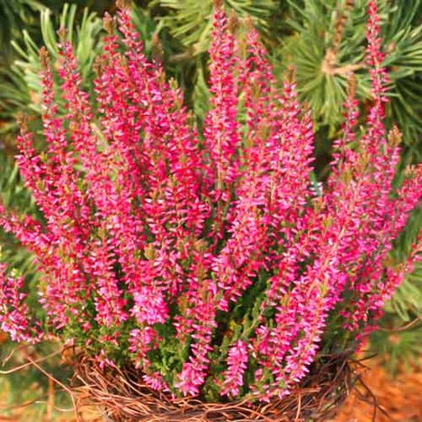 Вереск обыкновенный Диско Квин низкорослый многолетний кустарник, с плотной шаровидной кроной. К августу наступает пора цветения и темно-зеленые мелкие игольчатые листья уходят на второй план. Взору открываются многочисленные и довольно крупные, махровые цветы. Соцветие до 15 см. Цвет насыщенный от малинового до пурпурно-красного. Продолжает цвести до конца октября. Воздух наполняется терпким медовым ароматом.
