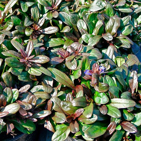 Для этого сорта характерна зеленовато-пурпурная окраска кожистых листьев, на фоне которых весной распускаются яркие синие цветы. Высота живучки не превышает 15 сантиметров. Этот сорт легко адаптируется к любому типу почвы, но предпочитает затененные места