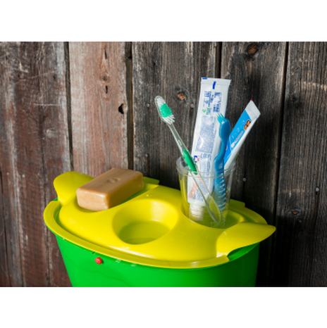 Навесной рукомойник со штоком крепится на любую вертикальную поверхность на шурупы (в комплект не входят). На крышке предусмотрены удобные выемки под стакан для зубных щеток и мыло.