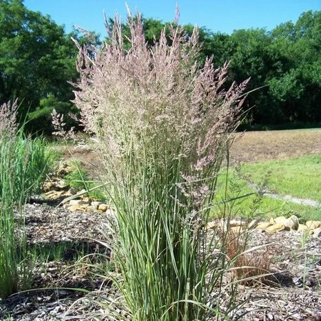 Отличается быстрой скоростью роста, эффектным внешним видом в течение всего года. Ценится за пеструю окраску листьев. Высота растения до 1,5 метра, в ширину разрастается слабо. Листья пёстрые, с кремово-белыми полосами по краю. Узкая изящная листва ниспадает под собственным весом, делая куртины похожими на миниатюрные фонтанчики. Цветет с начала лета и до самых заморозков. Расцветка раскидистых метелок постепенно переходит от бледно-розовой в желто-бурую. Неприхотлив в уходе, морозостоек.